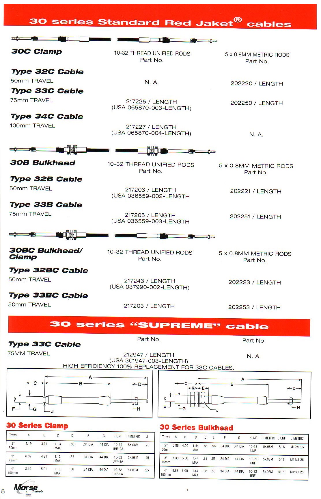 The old Morse ordering codes were very simple to work out. ie 33C equals a 30s cable with 3″ (75mm) of travel with clamp fittings. 32B equals a 30s cable with 2″ (50mm) of travel with bulkhead fittings.