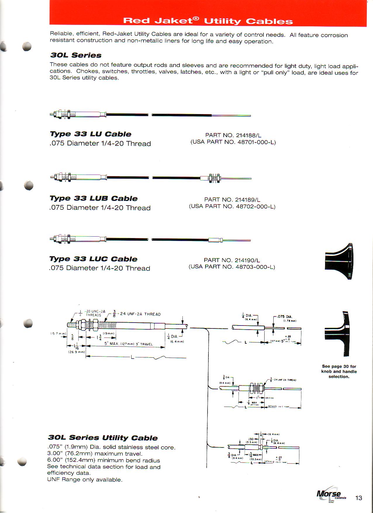 All control cables feature corrosion resistant construction and non metallic liners for long life and easy operation. Typically used for throttle, fuel shut off, valves, latches, switches and engine choke, Cable Controls can manufacture for your custom requirement.